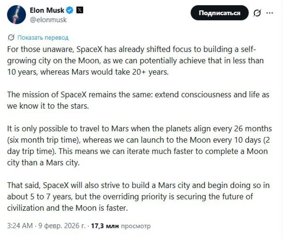 "SpaceX artıq diqqətini Ayda özünü təmin edən bir şəhər qurmağa yönəldib və biz buna on ildən az müddətdə nail ola bilərik", - deyə amerikalı sahibkar X sosial media platformasında yazıb.