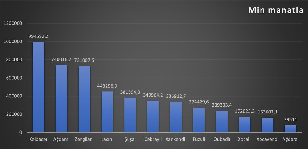 Qeyd edək ki, hesabat dövründə ən çox vəsait Kəlbəcər (994.6 mln. 11 min manat), Ağdam ( 740 mln. manat) və Zəngilan (731 mln. manat) rayonlarına ayrılıb.