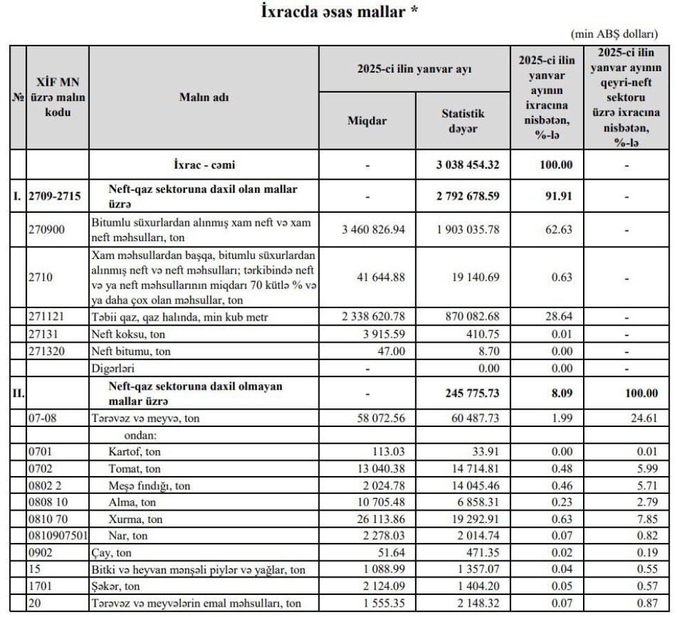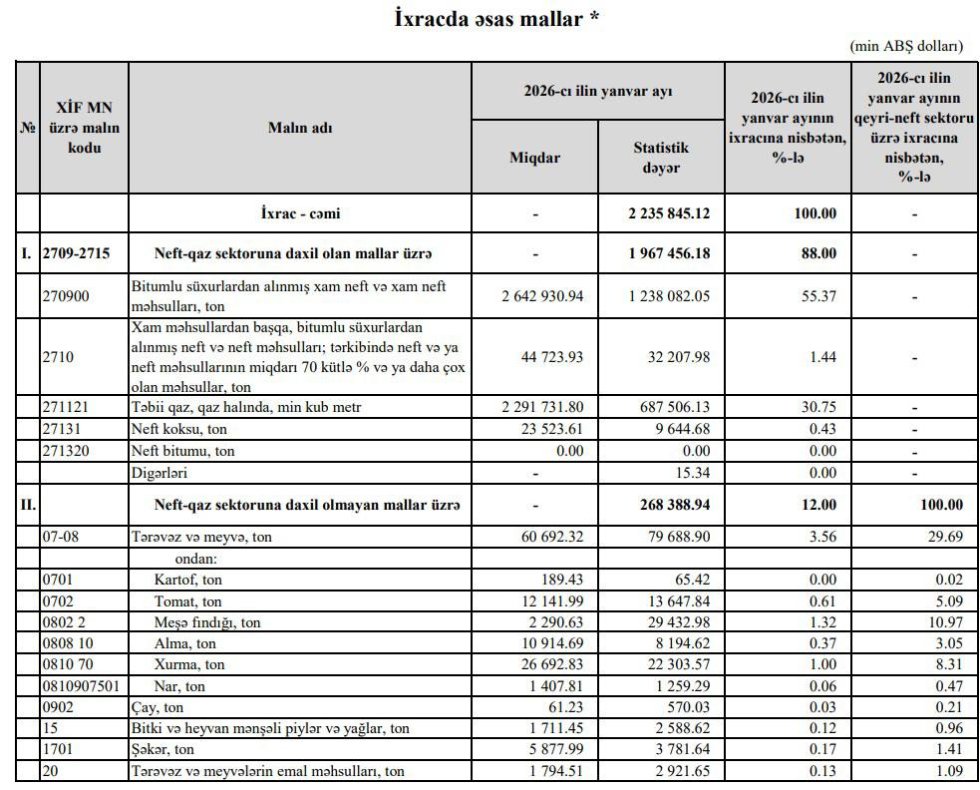 2026-cı ilin yanvar ayında Azərbaycanın ümumi ixracı 2 235 845 000 ABŞ dolları təşkil edib ki, bu da 2025-ci ilin eyni dövrü ilə müqayisədə 802 609 000 ABŞ dolları və ya 26,4% azalma deməkdir.