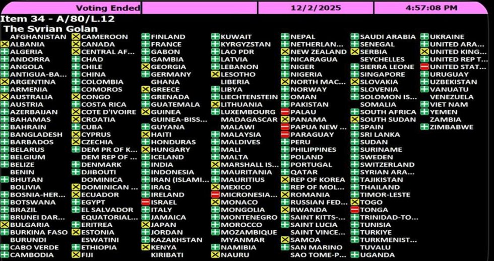 BMT Baş Assambleyası İsraili Holan təpələrindən geri çəkilməyə çağıran qətnaməni təsdiqləyib. 123 ölkə lehinə, yeddi ölkə (ABŞ da daxil olmaqla) əleyhinə səs verib, 41 ölkə isə bitərəf qalıb.