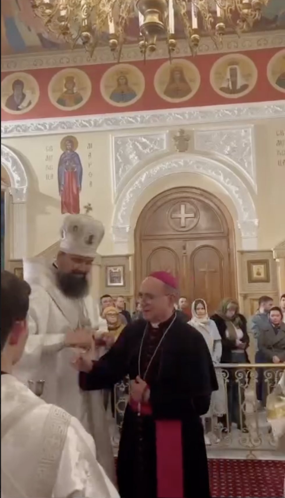 Dərc olunmuş görüntülərdə katolik keşişin ibadətdə iştirak etdiyi, ikona ehtiram göstərdiyi və dindarları şəxsən yağla yağladığı görünür.