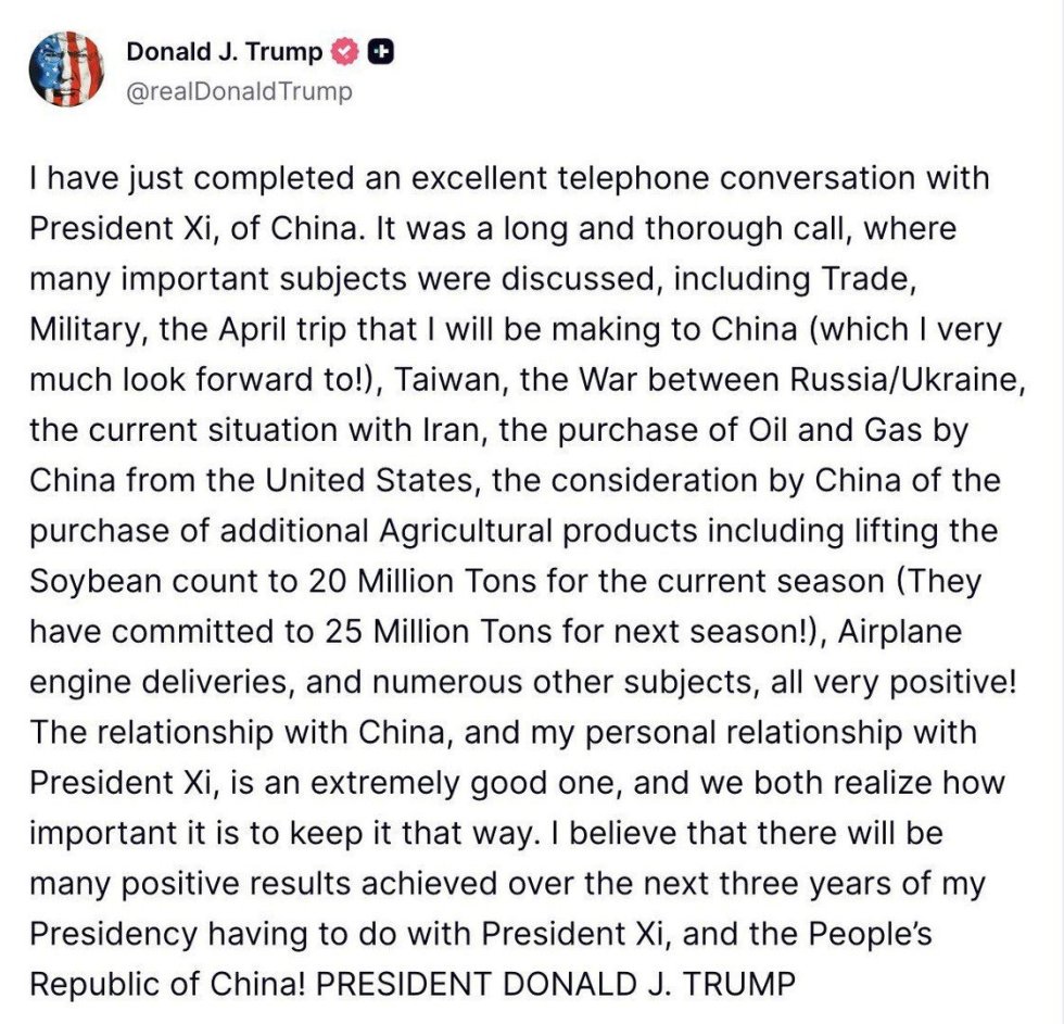 Bu barədə Tramp “Truth Social” hesabında paylaşım edib. O qeyd edib ki, telefon danışığı zamanı İran ətrafında mövcud vəziyyət, Rusiya-Ukrayna müharibəsi, ticarət və hərbi məsələlər, eləcə də Tayvan mövzusu müzakirə olunub.