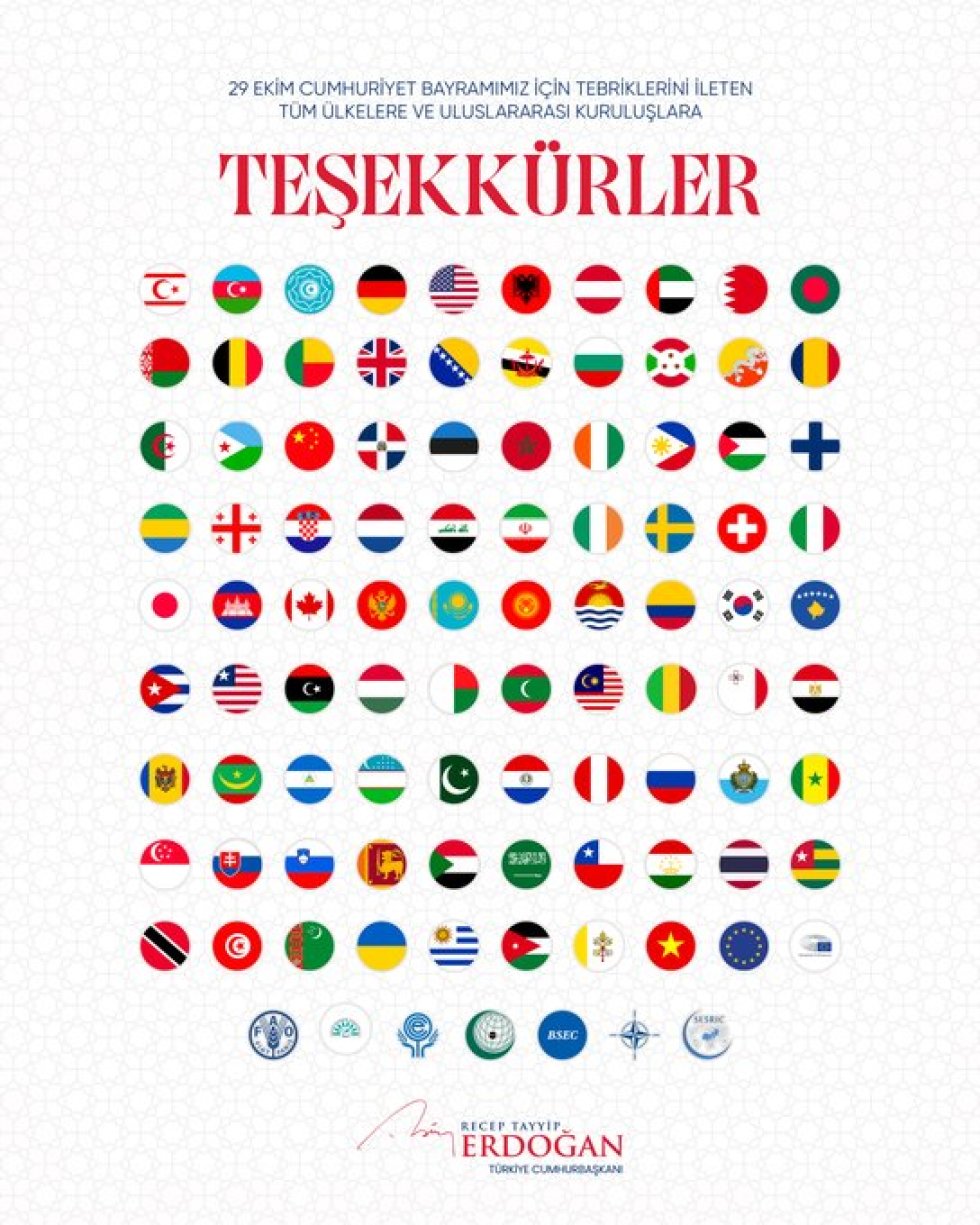 Türkiyə Prezidenti Rəcəb Tayyib Ərdoğan Türkiyə Cümhuriyyətinin qurulmasının 102-ci ildönümü münasibətilə təbriklərinə görə Azərbaycan da daxil olmaqla, bir sıra dost və qardaş ölkələrə təşəkkürünü bildirib.