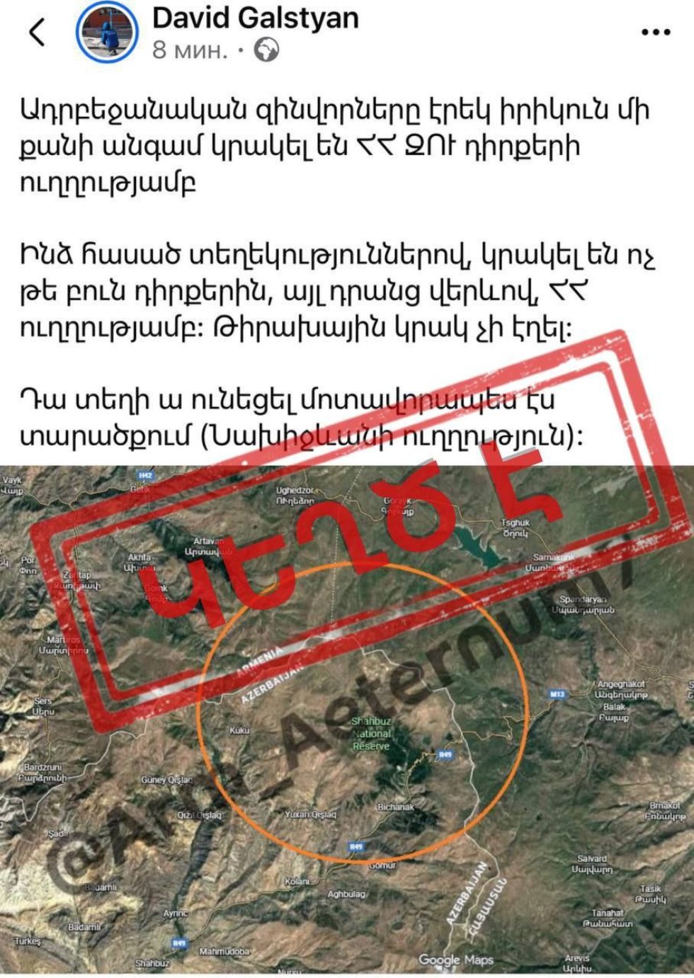 Ermənistan Müdafiə Nazirliyinin sözçüsü Aram Torosyan sosial mediada Azərbaycan silahlı qüvvələrinin Naxçıvan ərazisindəki Ermənistan mövqelərinə bir neçə dəfə atəş açdığı barədə yayılan məlumatları təkzib edib.