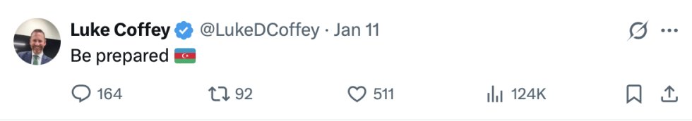 İranda davam edən etirazlar fonunda Hudson İnstitutunun baş eksperti Lük Koffi sosial media saytında X-də Azərbaycan bayrağı və "Hazır olun" başlığı ilə bir mesaj paylaşdı.
