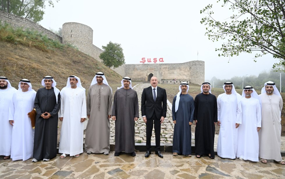 Azərbaycan Respublikasının Prezidenti İlham Əliyev və Birləşmiş Ərəb Əmirliklərinin Prezidenti Şeyx Məhəmməd bin Zayed Al Nəhyan Şuşa qalasının önündə foto çəkdiriblər.