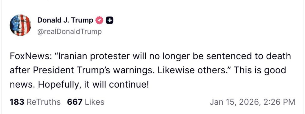 ABŞ prezidenti Donald Tramp Fox News-da yayımlanan bir reportajda iddia edir ki, onun ictimai xəbərdarlıqlarından sonra bir iranlı etirazçı artıq ölüm cəzası ilə üzləşmir.