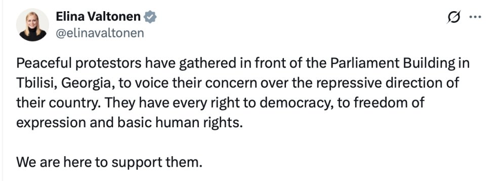 "Gürcüstanın paytaxtı Tbilisidə parlament binası qarşısına toplaşan dinc etirazçılar ölkələrinin repressiv istiqaməti ilə bağlı narahatlıqlarını ifadə ediblər. Onların demokratiyaya, ifadə azadlığına və əsas insan hüquqlarına tam hüququ var.