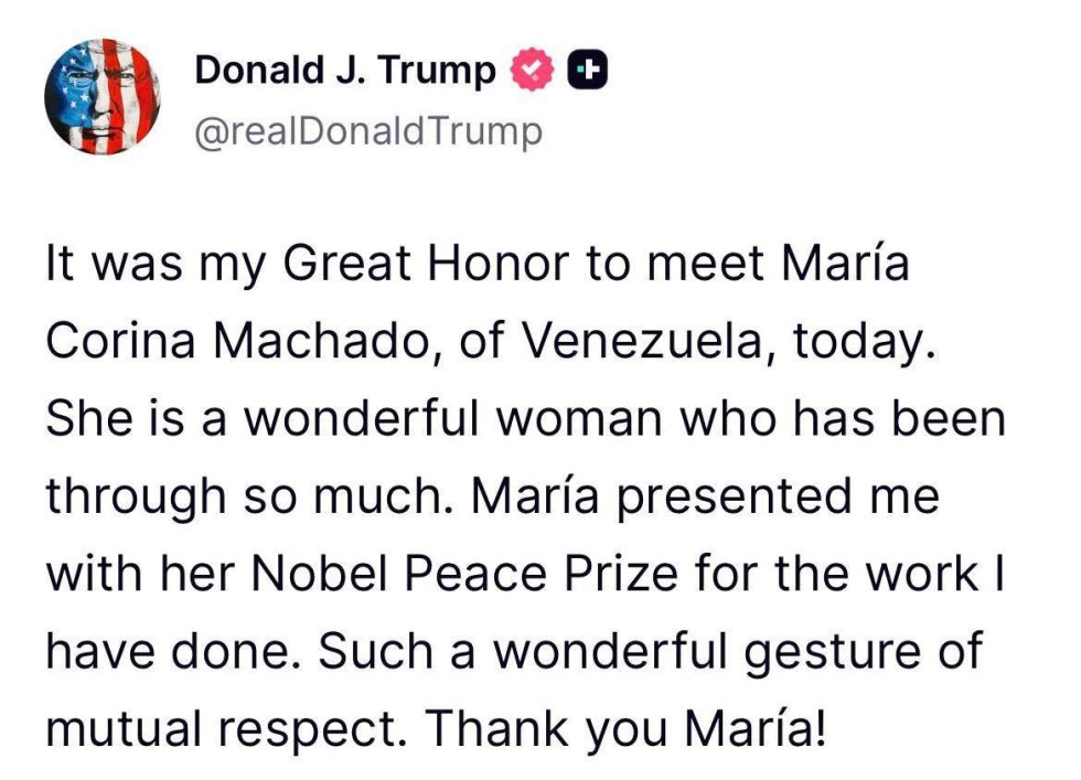 "Bu gün V\venesuelalı Maria Korina Maçado ilə görüşmək böyük şərəf idi. O, çox şeydən keçmiş əlamətdar bir qadındır. Maria mənə gördüyüm işə görə Nobel Sülh Mükafatını təqdim etdi. Qarşılıqlı hörmətin necə də gözəl bir jestidir. Təşəkkür edirəm, Maria!", - deyə ABŞ Prezidenti yazıb.
