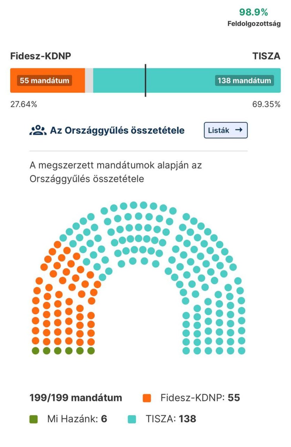 Səslərin təxminən 99%-i hesablandıqdan sonra "Tisa"nın 199 yerlik Macarıstan parlamentində üçdə iki hissədə (təxminən 138 yer) rahat çoxluq qazanmaq üçün hər şansı var.