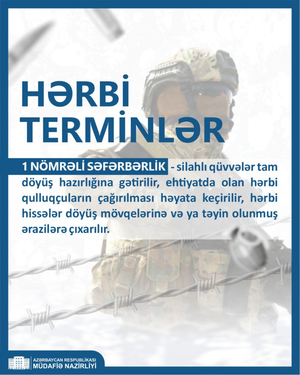 Azərbaycan Müdafiə Nazirliyi 1-ci Səviyyəli səfərbərlik zamanı riayət edilməli olan prosedur barədə məlumat dərc edib: