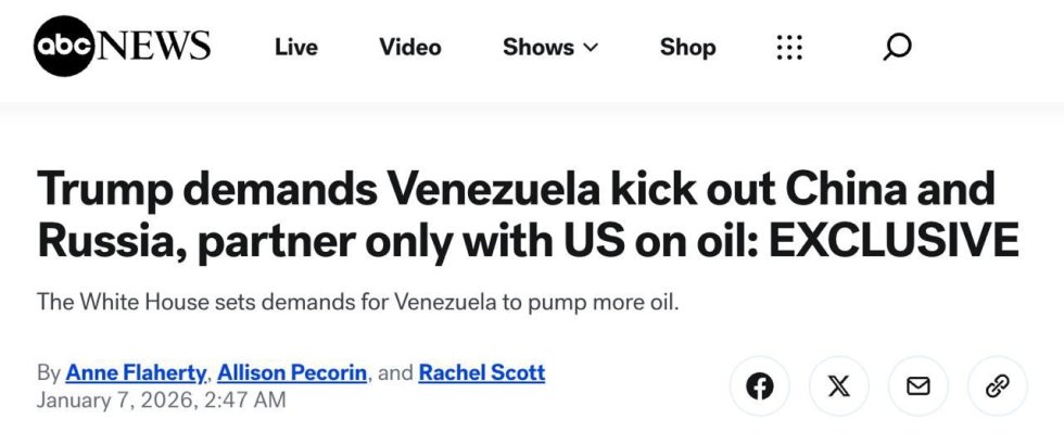 ABC News mənbələrə istinadən xəbər verir ki, Tramp Venesueladan Çin, Rusiya, İran və Kuba ilə əlaqələri kəsməsini tələb edib.