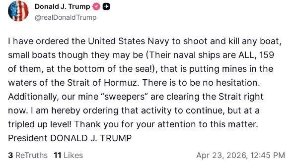 "Mən ABŞ Hərbi Dəniz Qüvvələrinə Hörmüz boğazının sularında mina qoyan istənilən qayığa, nə qədər kiçik olursa olsun (onların 159 hərbi gəmisinin hamısı dənizin dibindədir!), atəş açmağı və batırmağı əmr etmişəm. Heç bir tərəddüd olmamalıdır. Bundan əlavə, mina axtaran gəmilərimiz hazırda boğazı təmizləyir. Bununla bu fəaliyyətin davam etməsini, lakin üçqat səviyyədə olmasını əmr edirəm! Bu məsələyə diqqət yetirdiyiniz üçün təşəkkür edirəm."
