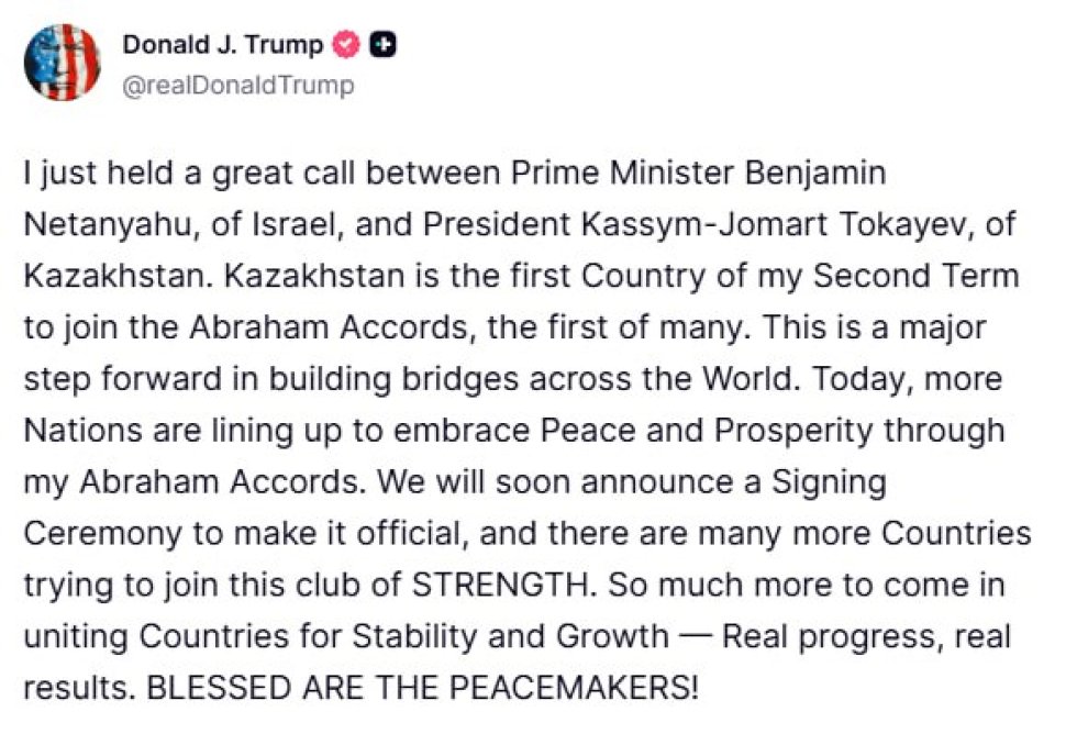 "Qazaxıstan mənim ikinci müddətimdə “İbrahim Sazişi”nə qoşulan ilk ölkə olacaq. Bu güclü kluba qoşulmaqda maraqlı olan bir çox ölkə var", - Tramp yazıb.