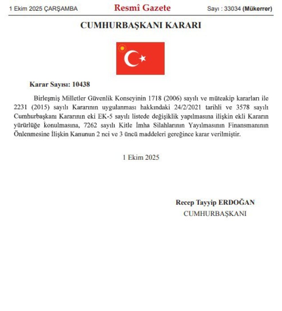 Türkiyə Prezidenti R.T.Ərdoğan müvafiq fərmanı oktyabrın 1-də imzalayıb. Türkiyə hökuməti BMT Təhlükəsizlik Şurasının qətnamələrinə uyğun olaraq 22 iranlı şəxs və 17 təşkilatın aktivlərini dondurub.