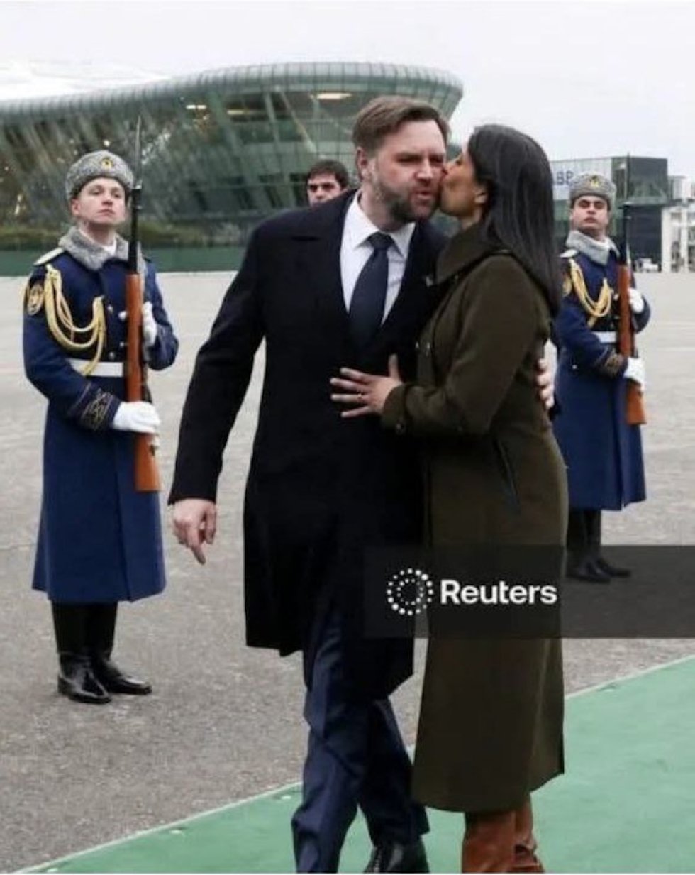 Bakıya çatdıqdan sonra ABŞ vitse-prezidentinin həyat yoldaşı ayrı-ayrı maşınlarla yola düşməzdən əvvəl onu öpdü.