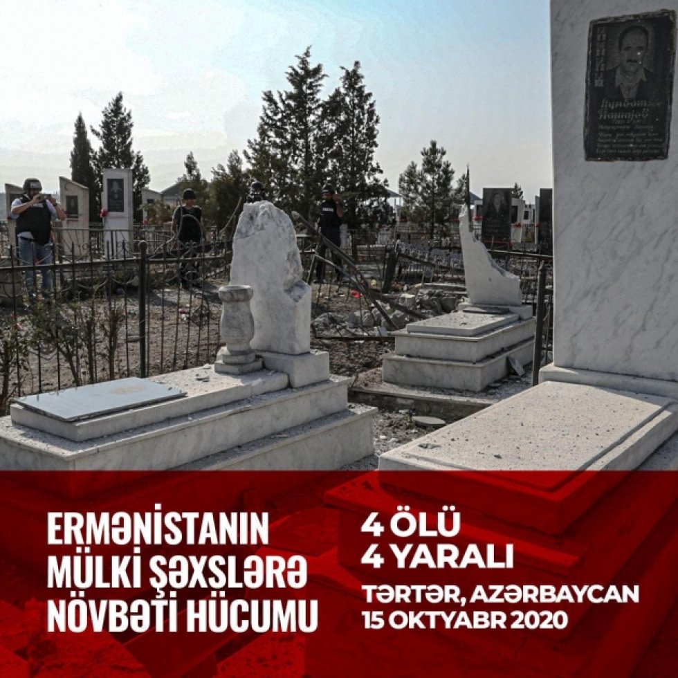 • Ermənistan silahlı qüvvələri Tərtər şəhər qəbiristanlığını dəfn mərasimi zamanı qəsdən ağır artilleriyadan intensiv atəşə tutub. Bu xain hücum zamanı üç nəfər həlak olub, beş nəfər xəsarət alıb. Beləliklə, düşmənin mülki əhalini atəşə tutması nəticəsində həlak olanların sayı 46-ya, xəsarət alanların sayı 223-ə çatıb. Bu barədə Baş Prokurorluq məlumat yayıb.