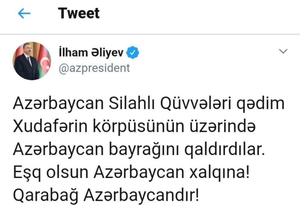 • Azərbaycan Silahlı Qüvvələri qədim Xudafərin körpüsünün üzərində Azərbaycan Bayrağını qaldırdılar. Prezident İlham Əliyev bunu özünün rəsmi tviter səhifəsində bildirib.