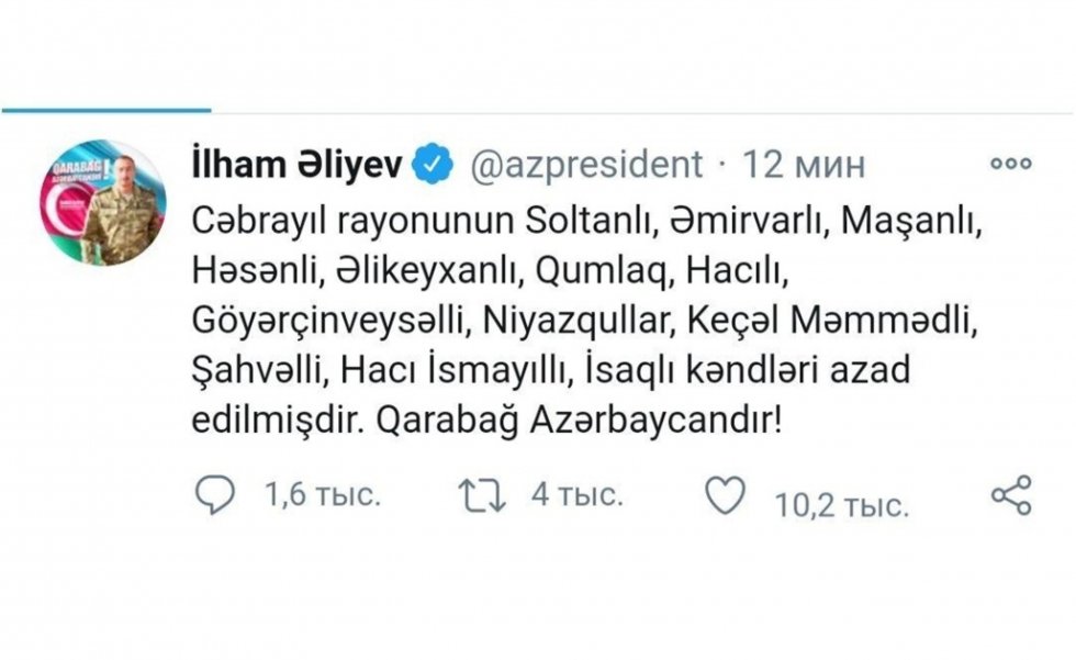 • Cəbrayıl rayonunun Soltanlı, Əmirvarlı, Maşanlı, Həsənli, Əlikeyxanlı, Qumlaq, Hacılı, Göyərçinveysəlli, Niyazqullar, Keçəl Məmmədli, Şahvəlli, Hacı İsmayıllı, İsaqlı kəndləri azad olunub. Bu barədə Prezident İlham Əliyev tviter hesabında məlumat verib.