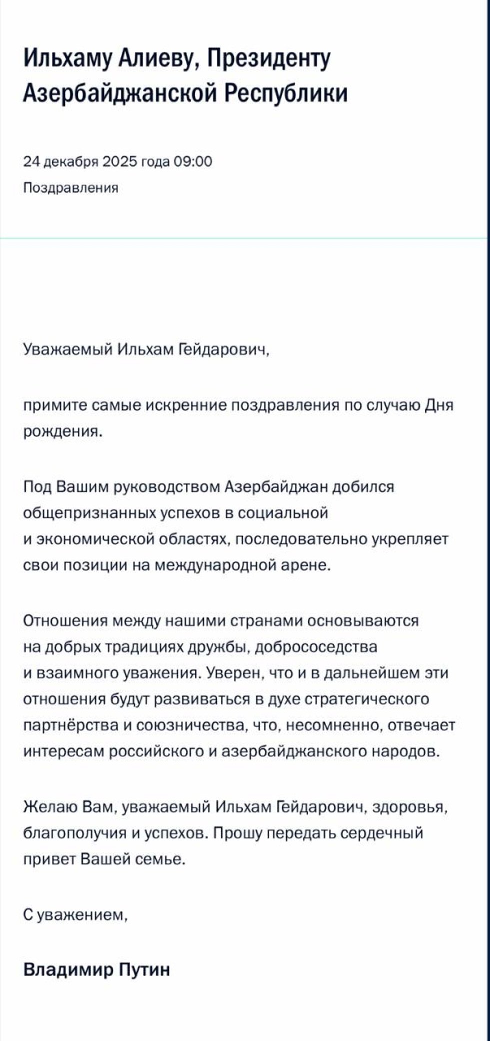 Rusiya Federasiyasının Prezidenti Vladimir Putin Azərbaycan Prezidentini təbrik edib: